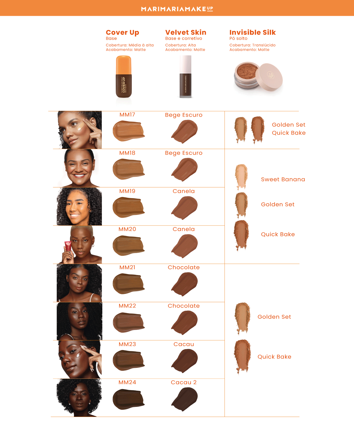Um toque aveludado à sua pele. Super resistente e com uma cobertura incrível, a base Cover Up permite a construção de camadas. Com uma fórmula leve e respirável, ela uniformiza a aparência da pele para um acabamento matte incrível.