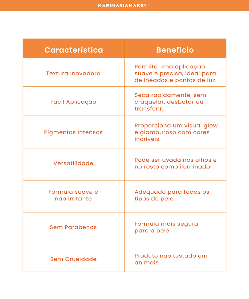 Textura Inovadora: A fórmula gelatinosa permite uma aplicação suave e precisa, ideal para criar delineados e pontos de luz com facilidade. Fácil Aplicação:A sombra desliza facilmente sobre a pele e seca rapidamente, garantindo um acabamento impecável sem craquelar, desbotar ou transferir. Pigmentos Intensos: Disponível em cores incríveis, com pigmentos intensos que proporcionam um visual glow e glamuroso. Versatilidade: Pode ser utilizada nos olhos para um acabamento impecável ou no restante da face como iluminador, adicionando um toque de brilho onde você desejar.